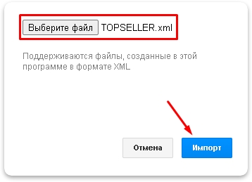 Выберите файл, который мы скачали и подтвердите Импорт