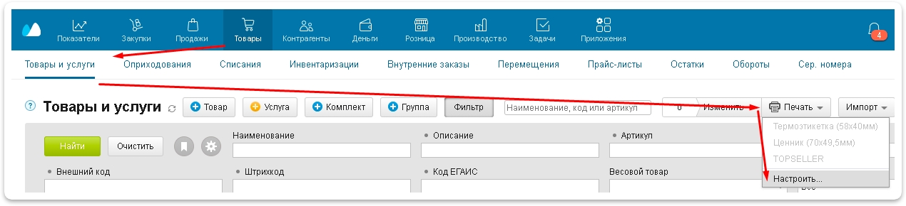 Зайти в МойСклад в раздел Товары → Товары и услуги