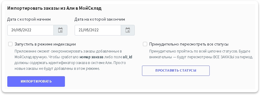 Запустить в режиме индексации: эта функция нужна, если Вы заводили заказы в учетную систему в ручную и у вас номер заказа из маркетплейса указан либо в нумерации заказов, либо в специальном доп. поле ali_id в учетной системе.