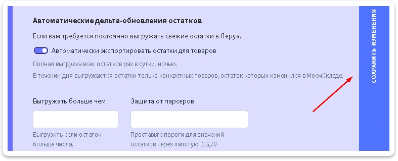 Если Вам нужна автоматическая выгрузка остатка, включите этот пункт. Здесь так же можно указать больше какого числа Вы хотите выгружать остаток, чтобы у вас всегда был остаток в запасе. Нажмите кнопку