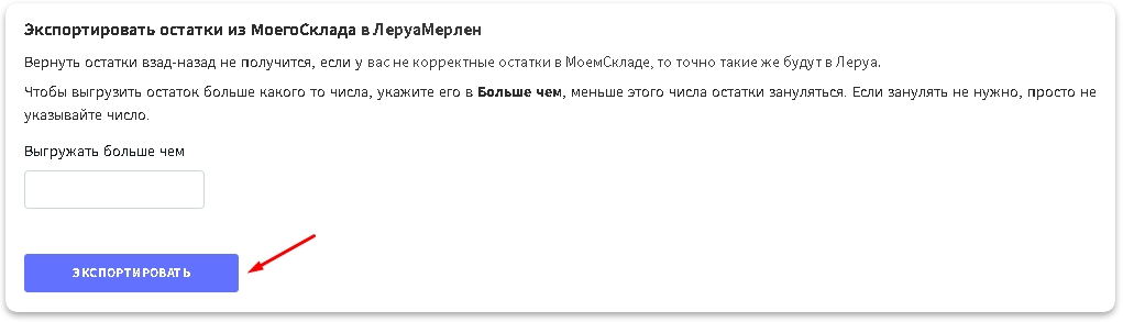 Одна из ключевых функций при работе по схеме продажи со своего склада. Вы можете просто вносить остатки в МС и автоматически экспортировать их в Леруа.
