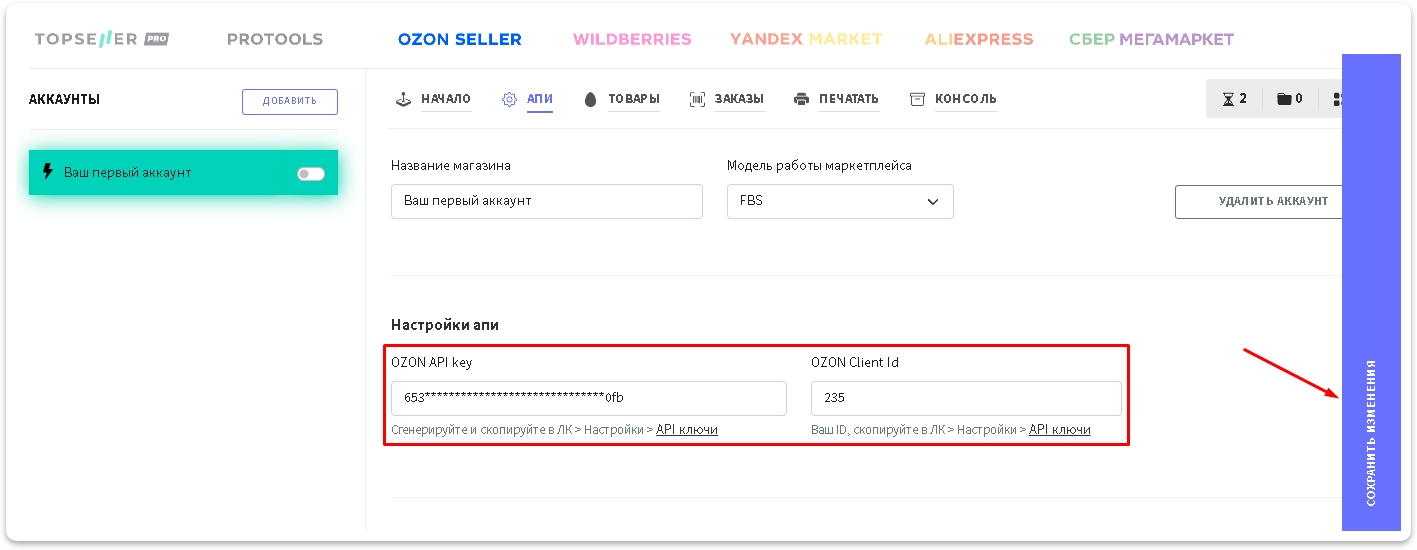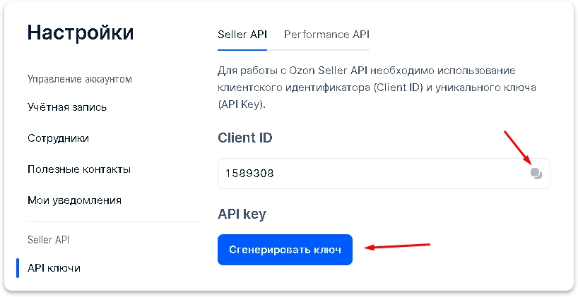 и нажать кнопку. Получить их можно в настройках Личного кабинета Ozon