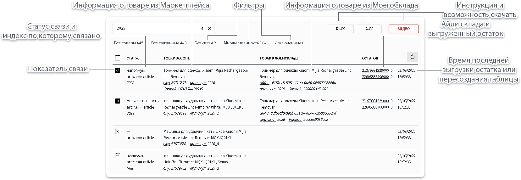 Фильтры - можно отфильтровать товары как вам удобно, например, чтобы не искать среди всего списка какие у вас без связи, выберите соответствующий фильтр