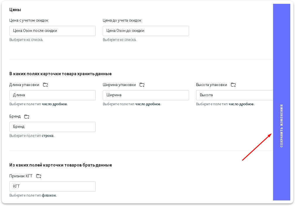 В данный раздел специально выведена отдельно настройка полей карточки товара в учетной системе, поскольку в большинстве случаев вам больше не придется сюда заходить.