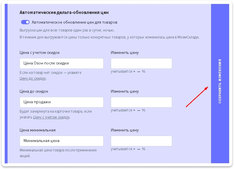 Используя эту функцию Вы можете автоматически экспортировать цены из учетной системы в Озон