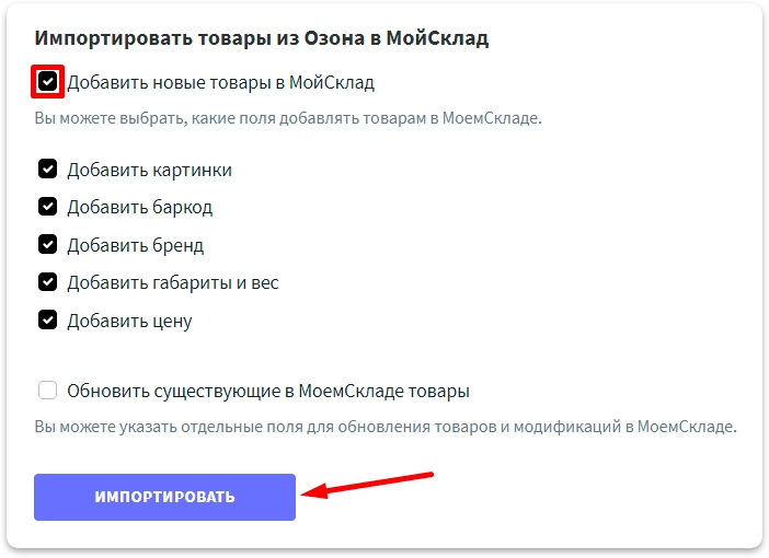 Обновить существующие в "Учетной системе" товарыВыберите параметры, которые вы хотите обновить и нажмите кнопку