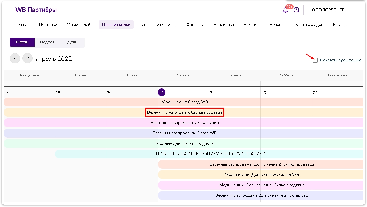 Отключите пункт показывающий прошедшие акции и выберите интересующую вас акцию, например: Весенняя распродажа: Склад продавца