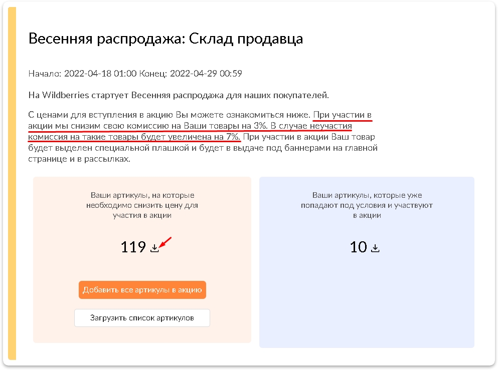 Запомните процент на который ВБ снизит комиссию при участии в акции и процент на который ВБ повысит комиссию, если не участвовать в акции, они нам далее пригодятся. Скачайте файл