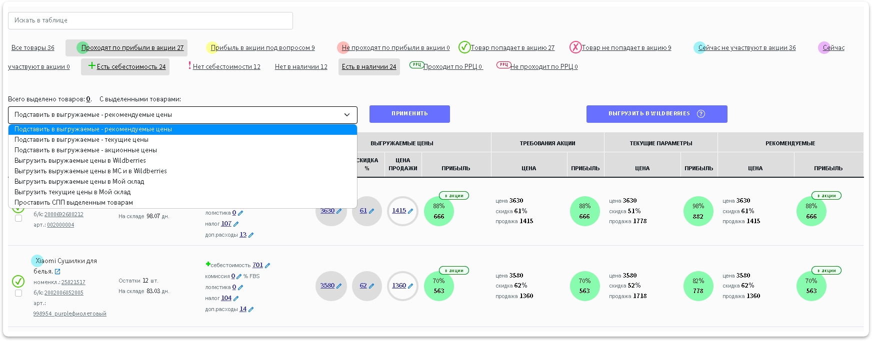 Выгрузить выгружаемые цены в МойСклад и в Wildberries