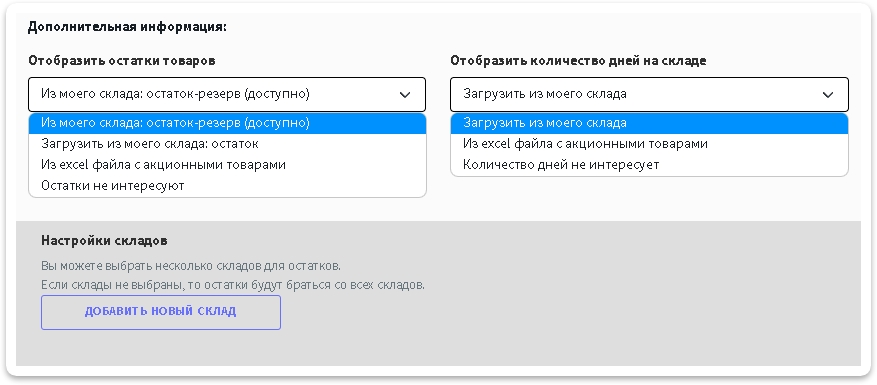 Также есть возможность отобразить остатки товара и количество дней на складе в отдельной колонке, для того чтобы видеть каких товаров много, какие подходят к концу, чтобы принимать решение участвуют они в акции или нет.
