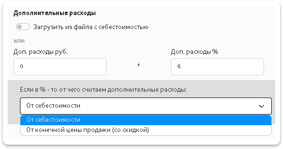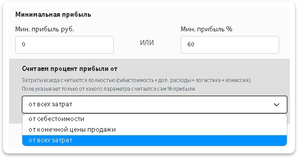 Здесь вы указываете сколько минимальный суммы денег вы хотите заработать с товара. Указать можно как в рублях так и в процентах. После заполнения данного параметра нужно также указать от какой величины программа будет вычислять вашу прибыль. Всего есть три варианта:
