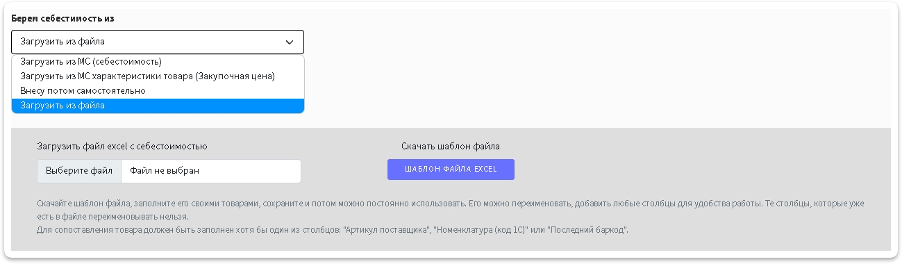 При выборе загрузки себестоимость через файл упростилось добавление себестоимости. Теперь можно скачать шаблон, заполнить, сохранить его и использовать регулярно. Так же можно при желании добавить в этот файл и дополнительные затраты.