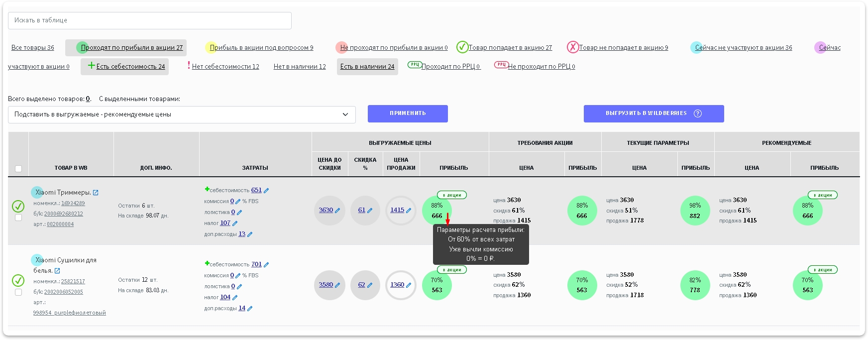 Если товар попадает в акцию, у него над кружочком прибыли помечается, что товар, если же товар не попадает в акцию у него будет пометка