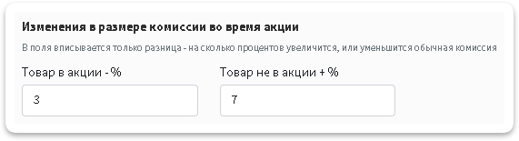 Выше мы с вами запоминали процент на который ВБ снизит комиссию при участии в акции и процент на который ВБ повысит комиссию, укажите их в отведенных для них полях