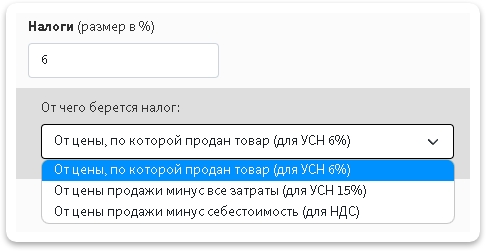 Также указываем сколько у вас составляют налоги и выбираем от чего будет браться налог: от цены, по которой продан товар, от цены продажи минус все затраты или от цены продажи минус себестоимость.