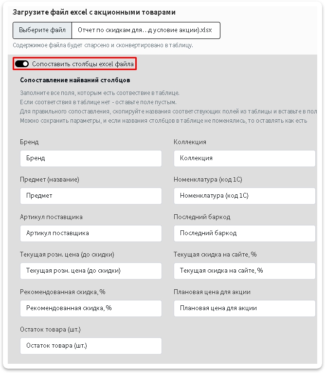 Если вдруг у вас свой формат эксель, вы можете сопоставить поля из своего эксель с нужными для нас параметрами, то включите ползунок соответствующего пункта и заполните как вам нужно