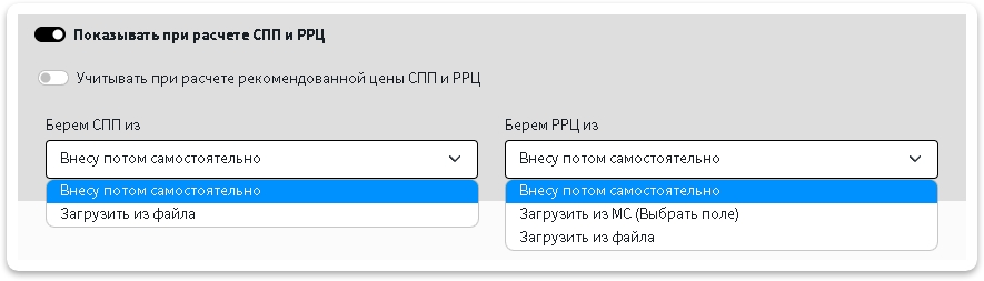 Добавлен учет РРЦ и СПП! Теперь Вы можете вести учет РРЦ и СПП, программа подскажет, когда цена продажи не проходит по РРЦ, данные вы можете загрузить из файла, внести вручную или взять из МС. Также Вы можете выбрать Любое поле (цены) из выпадающего списка, из которого брать РРЦ при расчете.