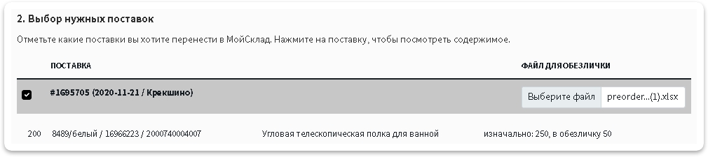 🧠 Важно! Если Вы загружали файл с заказом и система показала обезличку, то можно автоматом перенести непринятый товар на склад обезлички (нужно предварительно создать в МоемСкладе).