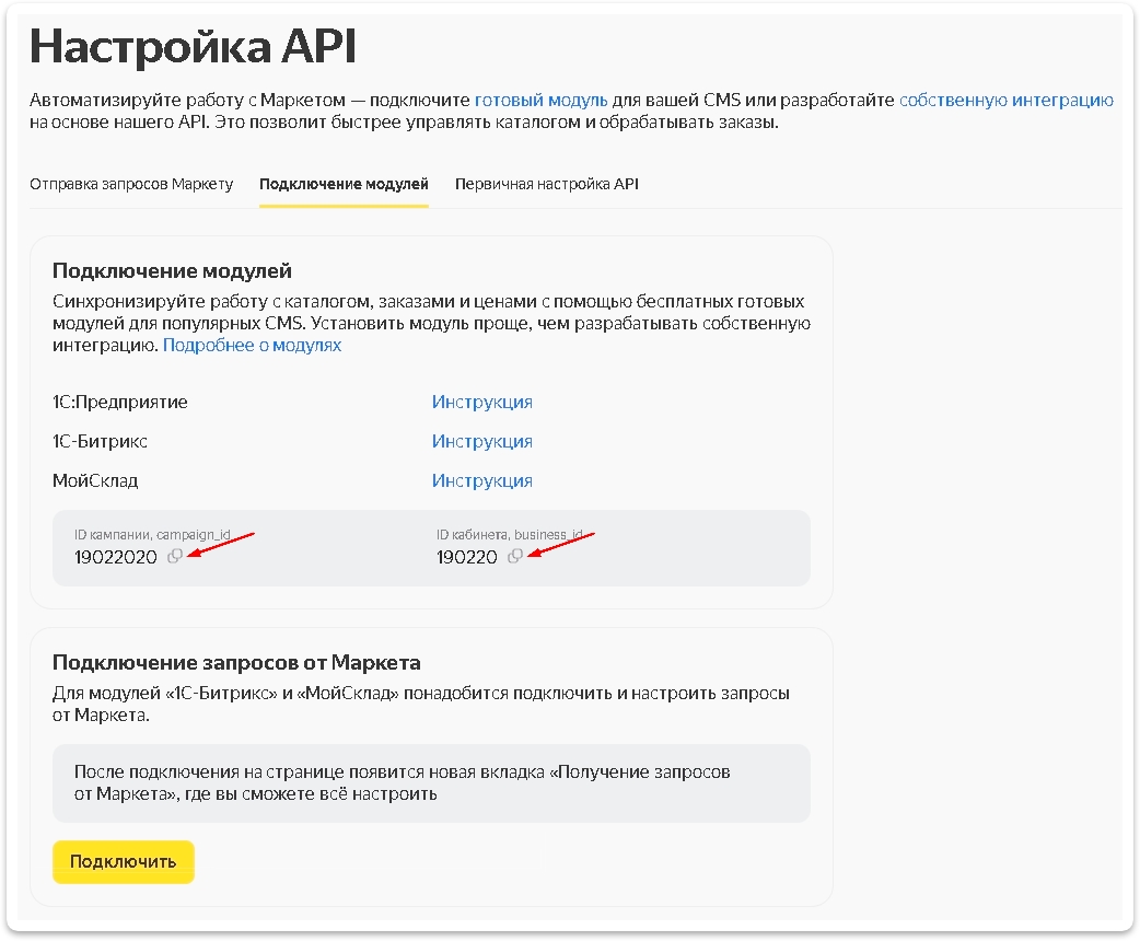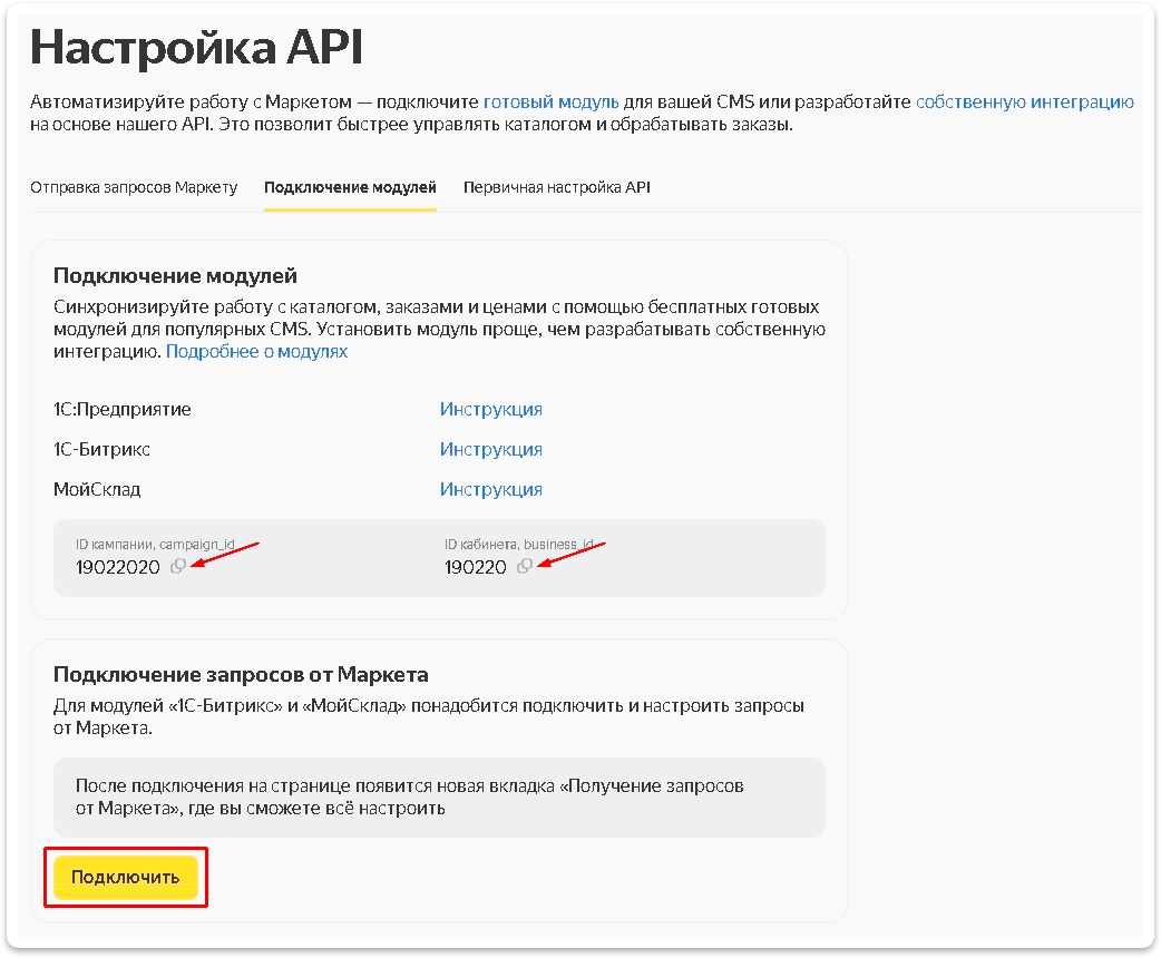 В меню Подключение модулей скопируйте Номер компании и Бизнес айди