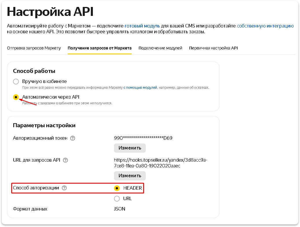 Так же перед этим в настройках Личного Кабинета Яндекс.Маркета нужно: сгенерировать Авторизационный токен, заполнить URL для запросов и указать Способ авторизации. Для этого: