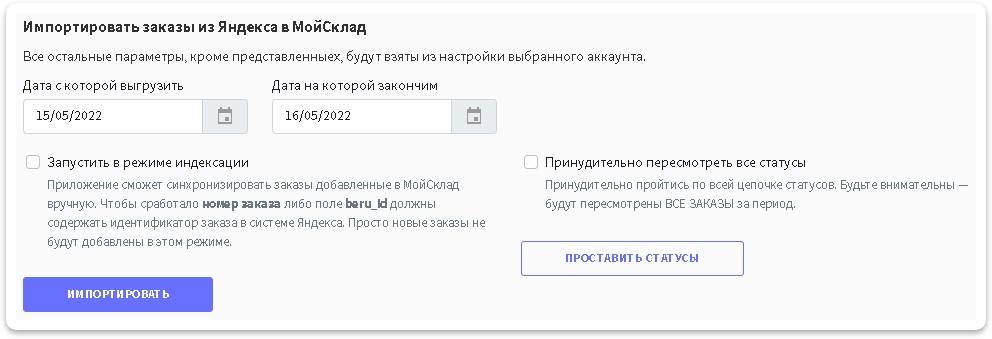 Запустить в режиме индексации: эта функция нужна, если Вы заводили заказы в МойСклад в ручную и у вас номер заказа из маркетплейса указан либо в нумерации заказов, либо в специальном доп. поле yandex_id в учетной системе.