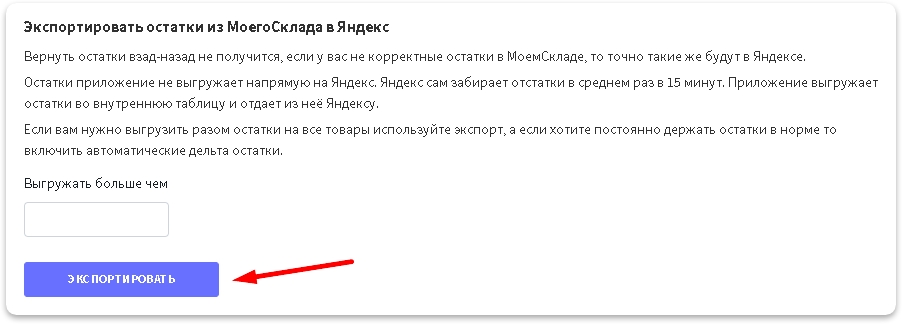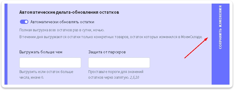Если вам нужна автоматическая выгрузка остатка, включите этот пункт. Здесь так же можно указать больше какого числа вы хотите выгружать остаток, чтобы у вас всегда был остаток в запасе. Нажмите кнопку