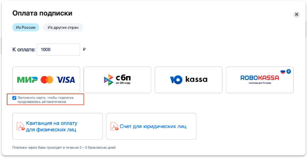 Выберите способ оплаты. Отметьте Запомнить карту, чтобы подписка продлевалась автоматически — с выбранной карты раз в месяц, в день оплаты, будет списываться сумма подписки.