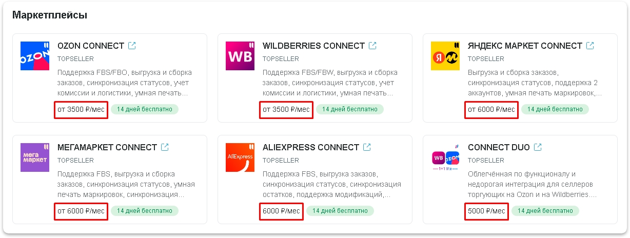 Каждый маркетплейс оплачивается отдельно (кроме DUO, где за два 5.000 рублей в месяц). Стоимость одного маркетплейса: