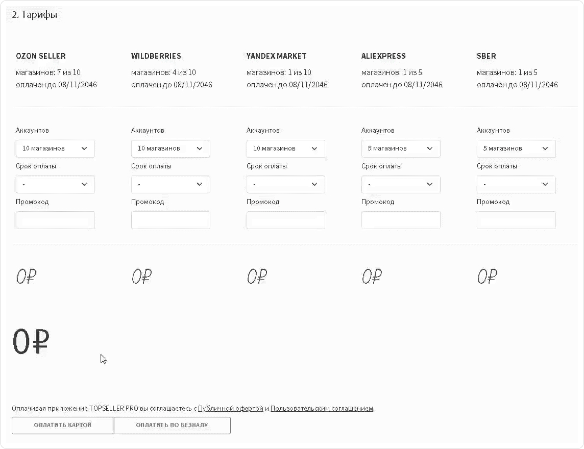 Каждый маркетплейс оплачивается отдельно. Стоимость одного маркетплейса - 5.000 рублей в месяц. Также есть другие тарифы, подробнее здесь.