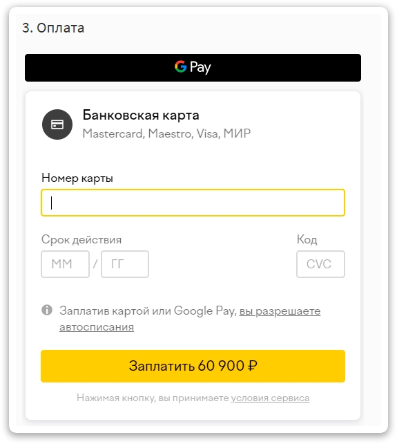 5. Нажмите на кнопку ОПЛАТИТЬ КАРТОЙ и у вас сгенерируется окно для оплаты. Введите данные для оплаты